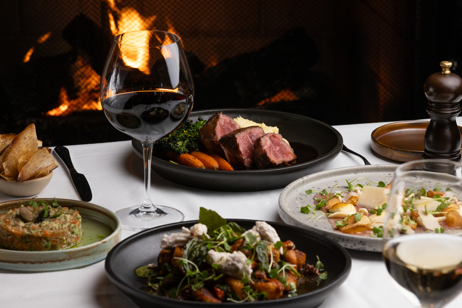 Warmed by a crackling fire, a romantic evening in the Grill Room awaits, featuring a five-course gourmet dining experience.